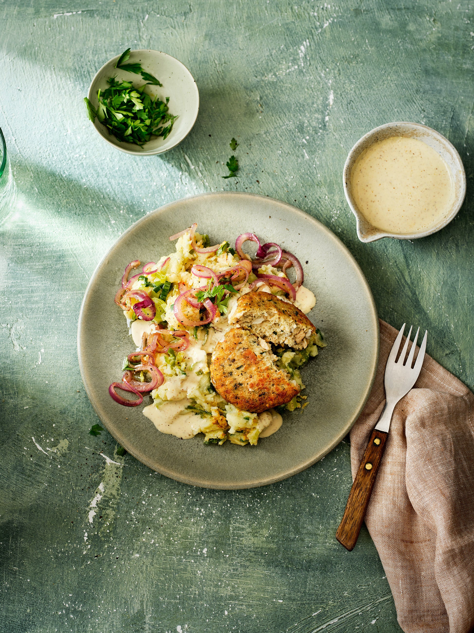 Kto powiedział, że dania na bazie roślin nie mogą wyśmienicie smakować? Nasz złocistobrązowy Wegański Kotlet Mielony Garden Gourmet, połączony z aromatycznym gulaszem ziemniaczanym z porem i musztardą, udowodnia, że wszyscy sceptycy się mylą. Ten przepis zapewni Ci niezwykłe doznania smakowe i sprawi, że poczujesz się jak w domu. Doskonale sprawdzi się jako danie wegańskie na obiad lub kolacje. Wypróbuj już teraz i podziel się z bliskimi!